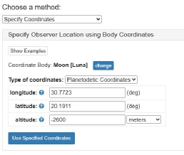 I’ve entered the latitude and longitude of the Apollo 17 site, and used an altitude that matches the convention for lunar sites, which is based on a sphere a set distance from the lunar centre. I’ve also tried it with “0” as the altitude value -