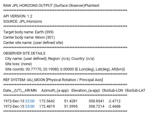 1) Prove you wrong (i.e., your ~51.4° elevation / ~172°–175° azimuth numbers from legacy/IAU_MOON-