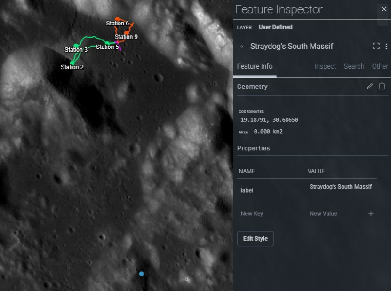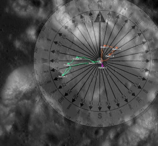 “Yes, the maps do say southwest but the photos say south .. Why?.. Because the photos were staged using a precursor to IAU_MOON that produced a 175 to 180 degree azimuth.. The traverse map, created 40 years later, used the more modern MEAN _ME that produced a 238 degree azimuth... And therein lies the contradiction.”