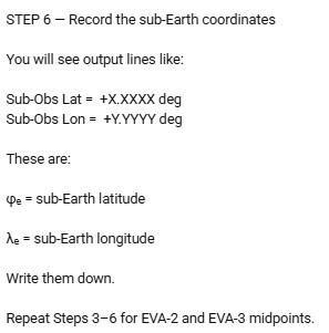 In other words, it’s where the centre of the Earth is, as seen by the observer form the moon. It has nothing to do with the position of the Earth in the lunar sky, other than the fact that it’s obviously influenced by lunar libration. So when he goes into step 6:
