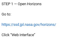 I’ve already shown the results of an ephemeris calculation above that shows JPL horizons calculating Earth’s elevation correctly, but stray gives step by step instructions. So let’s see if we can replicate his values.