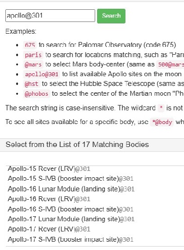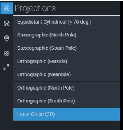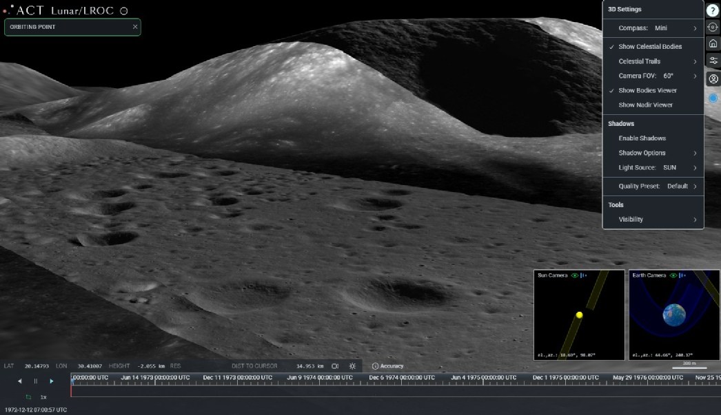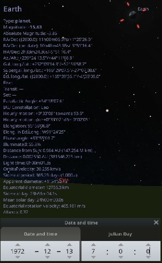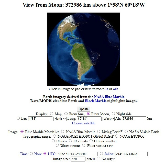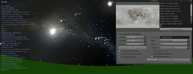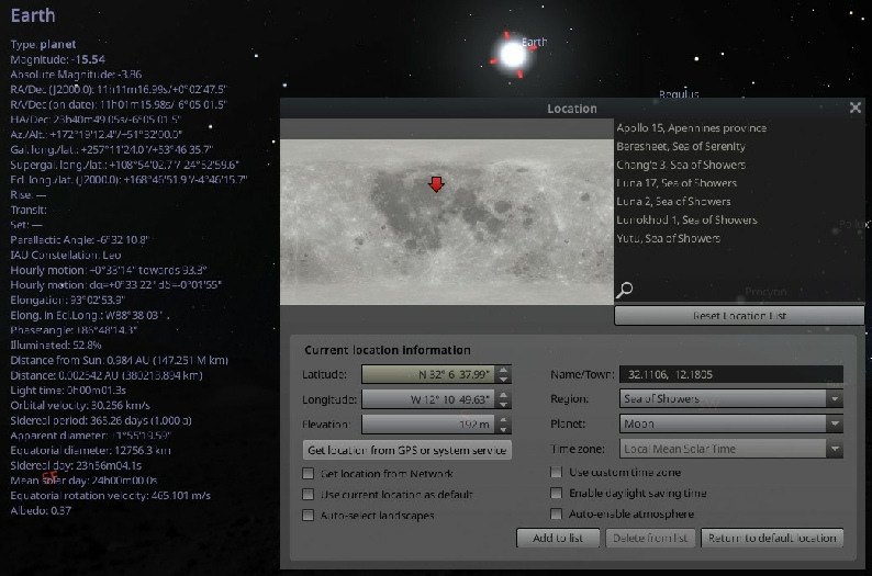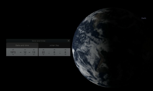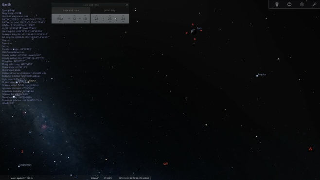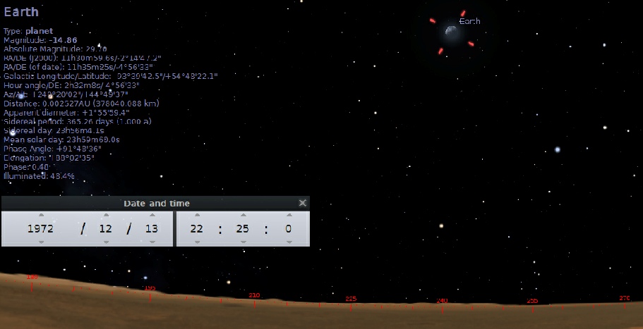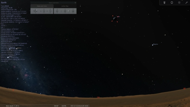 By changing the projection to ‘Lunar Globe’, it’s possible to set your location to a specific spot and rotate around it. You also have the option of entering a start date, and displaying the Earth. Here I’ve set the start date to coincide with Apollo 17, and I’m rotating around a point in the Taurus-