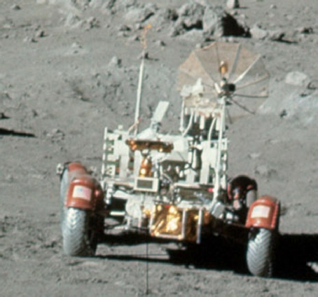 The bold emphasis is mine, but the reference is specific. What stray is trying to imply is that the rover is on a slope, and the 45 degree angle is what’s needed to compensate for that slope. Luckily we have a couple of good photos of the LRV in place at Station 2.
