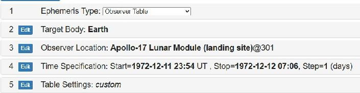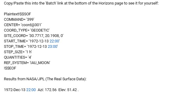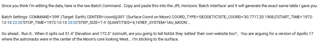 This whole discussion started because he didn’t agree with a statement by Gene Cernan about where Earth was in the sky. He then started to produce a whole load of ridiculous figures. He got taken up on those figures. He made false statements about what was on websites and in documents and he got corrected. He made claims about how software worked and got corrected. He made claims about how JPL Horizons works and got corrected. Every part of this “discussion” is about straydog making false claims and people refuting them with actual evidence. Everything on this page and on youtube has been a direct response to his bullshit, fabrications, dishonesty and mistakes.