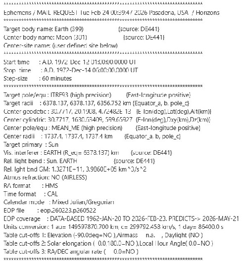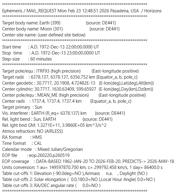 “This [45 degrees] is impossible, because Stellarium itself uses the JPL DE ephemerides, the Moon’s rotation matrix, and topocentric geometry. When set correctly, it ALWAYS reproduces the same result as SPICE within <0.3°.