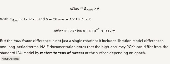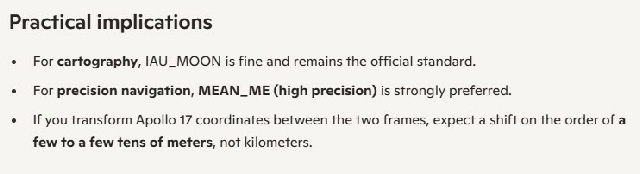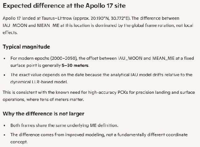 To make things worse for the poor little puppy, he now mysteriously can’t reproduce his figures. Grok thinks it’s because JPL have updated things. I think it’s because he never produced them in the first place. Grok also describes (in a comment on his channel) that IAU_MOON is a Principal Axis reference frame. It is not. It’s a Mean Earth frame just like MEAN_ME. It probably means Polar Axis. Principal Axis is a very different thing.