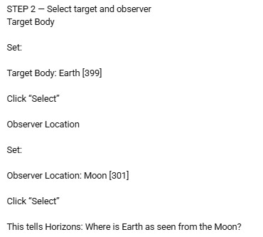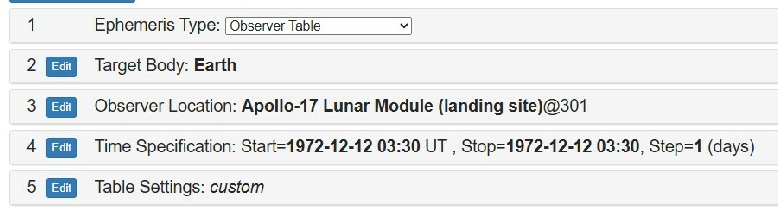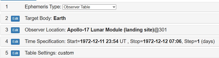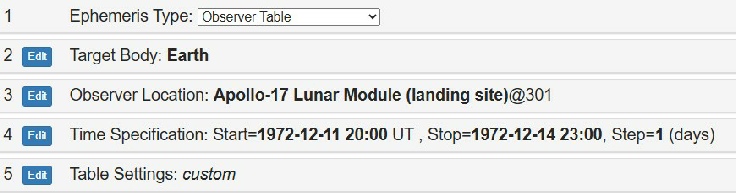 To compute Earth’s altitude from the lunar surface, the observer must be set to the Apollo 17 landing site (20.19°N, 30.77°E).