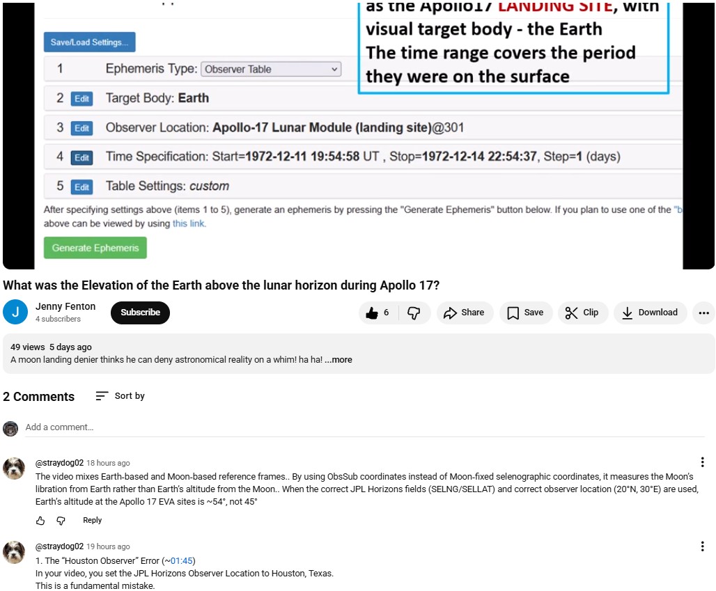 This is despite Jenny’s video (and my explanations above) clearly demonstrating that Stellarium doesn’t look at anything in the landscape that can affect the results. He also insists that if you put in the Apollo 17 landing site in Stellarium you get the values he’s claiming are correct, when you absolutely, definitely, do not, just like his other claim that putting a value compensating for Apollo 17’s delayed launch affects the figures. It does not, at least, not in the way he hopes -