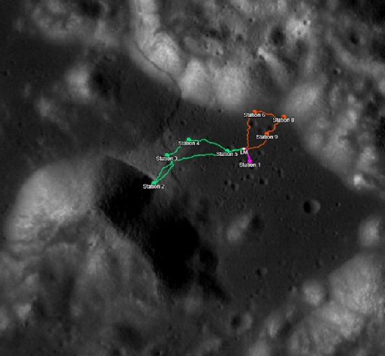 Again, there was no graduated scale on the HGA, and again, he is making a claim that the rover is pointing uphill on a 10 degree slope. To be fair, there is aoms discussion about the steepness of the Station 6 site at Tracy’s rock, see here. The crew make several references as to how steep it is, and there’s this note on the ALSJ page: