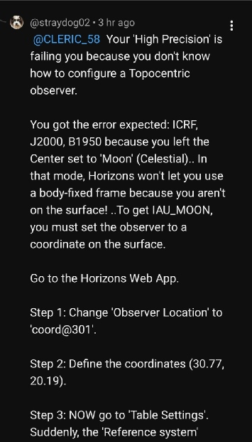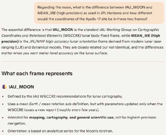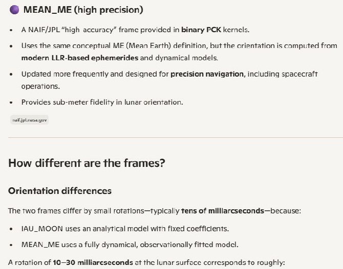 My CoPilot output matches Cleric’s more or less. Good of it to confirm that IAU_MOON is a Mean Earth frame, and that the two frames produce no level of difference that would affect the elevation and azimuth in the way his ridiculous numbers claim.
