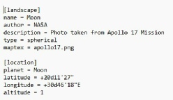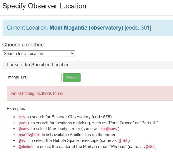 Searching ‘moon[301] as he instructs finds nothing. In fact searching ‘moon’ doesn’t help, it finds locations on Earth called ‘moon (below left). To actually get to Apollo 17’s site, you need to do as the page instructs and look for apollo@301, and from there you can pick lunar locations (below right).