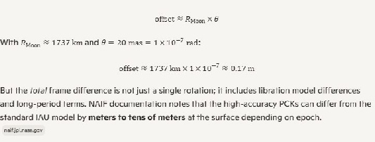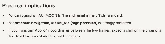 AI then tells me that it uses the centre of mass of the moon, combined with the long term average rotation and equator to derive a standard coordinate system. MEAN_ME and IAU_MOON both, therefore, do the same thing: they take the long term behaviour of the moon and derive a coordinate system that is fixed and unchanging.