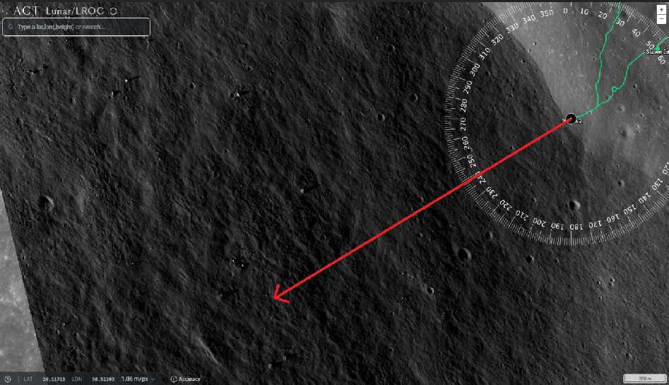 And just because we can, here’s a nice compass superimposed on Google Moon, centred on the LM, with zero degrees pointing north. What’s the bearing to station 2 stray? What’s the bearing to the centre of the South Massif, above which earth hangs? Where does 175 degrees send you? You don’t need complex astronomical models to demonstrate that your numbers are wrong.