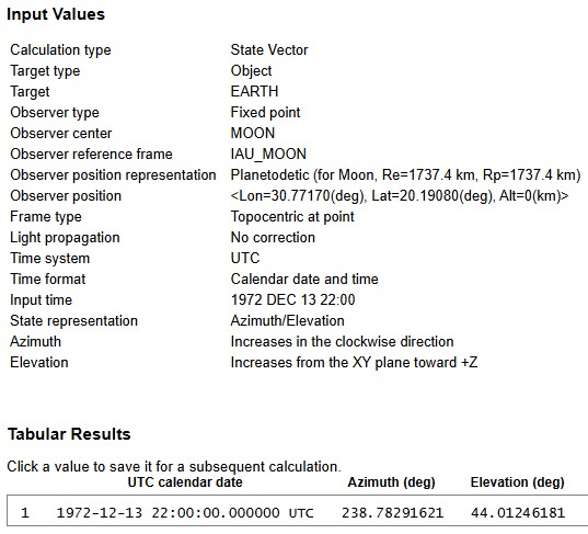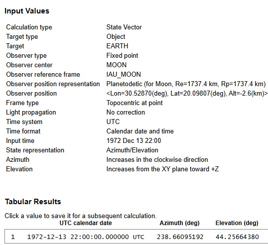 In other words, if I specify where I am, and where I want to be, it’ll tell me what direction I need to head in to get there. In this case I am at the Apollo 17 site, I want to head to Earth on December 12 ad 22:00. Best of all, because it’s SPICE based I can use IAU_MOON! Here are the two sets of outputs using IAU_MOON and MOON_ME: