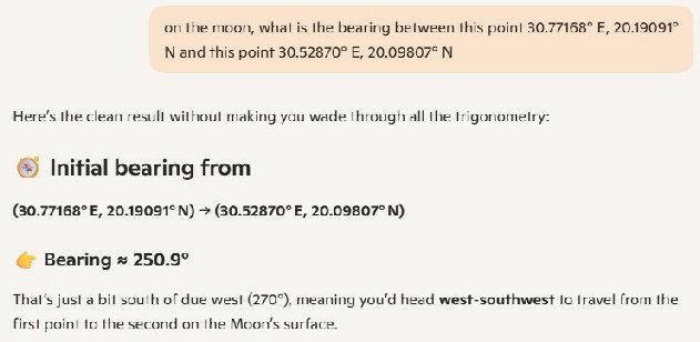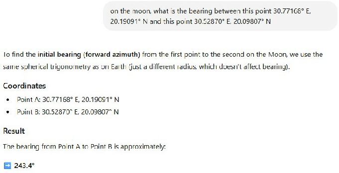 While we wait, Cleric decided to ask Grok, just like I did, what the bearing was between the LM and Station 2. He used the values in a paper stray quoted: