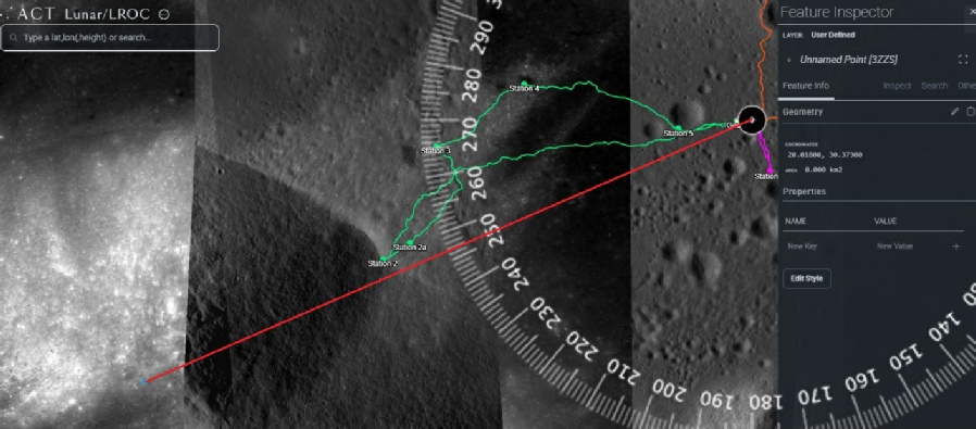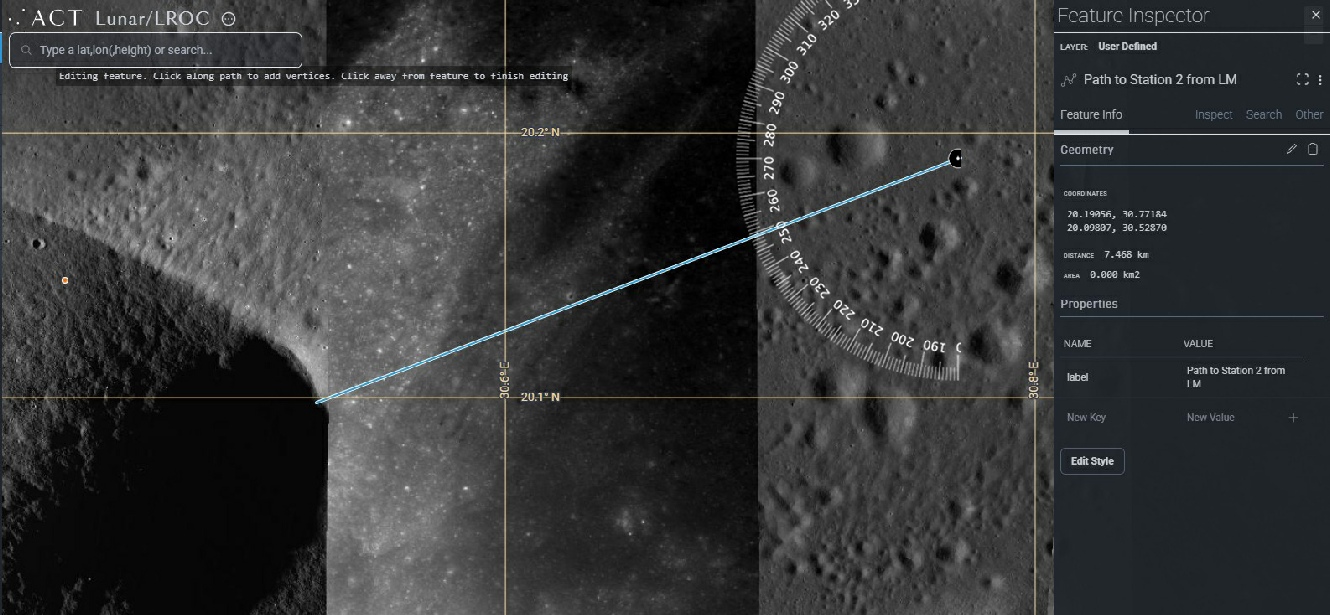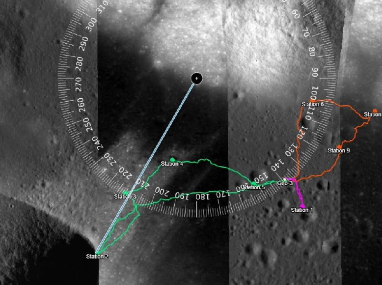 “The bearing from the LM (30.77168°E, 20.19091°N) to Station 2 (30.52870°E, 20.09807°N) is 247.9°.”