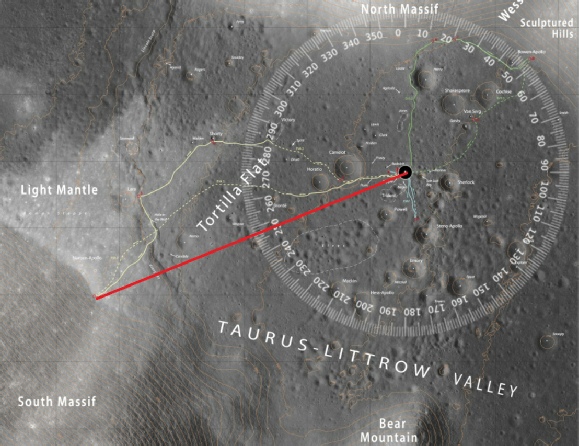 You do not get an azimuth of 238 degrees, or an elevation of 44 degrees. 238 degrees points, if you bothered to look at the map, to the southern end of the scarp, which joins the massif roughly at Nansen crater, the location of Station 2, where they photographed Earth above a boulder.