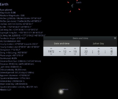 Remember Telnet? I had real trouble trying to get it to work on my PC, but there are telnet emulators that will allow you to run the code. I used this one. I was able to specify the Apollo 17 landing site as the observer location (29@301). This is the output it gives: