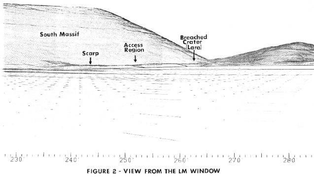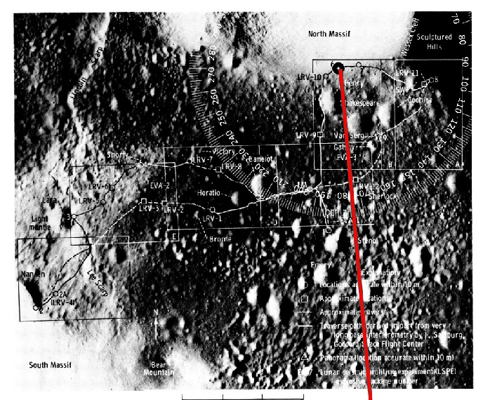 I’ve drawn a line through 175 degrees. It is nowhere near the south massif at all, let alone the centre of it. The image on which it’s superimposed is from the Apollo 17 Preliminary Science Report. So yes, while moving towards station 6 takes you north west, of the LM, it still doesn’t magically make the south massif move.