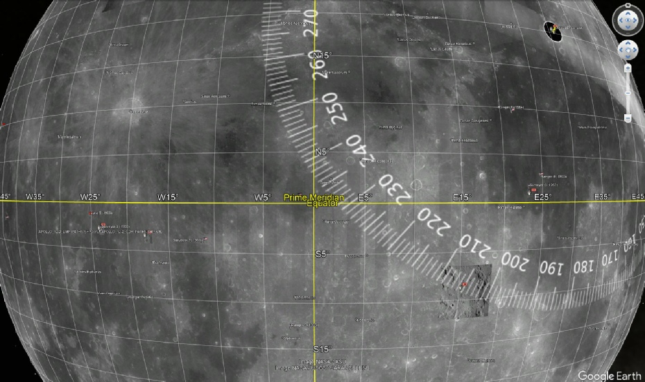 A throwaway stray comment is that we are trying to defend a reference frame that didn’t exist at the time of Apollo. This 2005 document gives a summary of the development of a standard for reference systems and frames. While the idea of a MEAN_ME as a formal system used by all wasn’t there in 1972, neither was IAU_MOON. The illustrations and discussion above show how the idea of an average for longitude and latitude were being used, but these things weren’t formally adopted as a standard until well after Apollo. The thing is, an object 1 metre long is always 1m long, regardless of whether a ruler exists to prove it. What matters is whether the ruler being used by one person matches that used by another. That’s what has happened with the development of our exploration of space by any means: a system of refinement and standardisation of the means of measuring things. Part of that refinement and standardisation, as far as the moon is concerned, used equipment data from the Apollo missions. Earth has dutifully hung above the South Massif for millions of years. Stray has never been able to reproduce a coordinate system that shows the bearing from where the lunar module sits as 175 degrees.