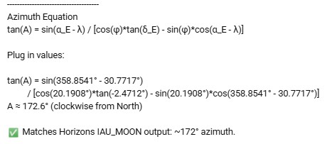 “My Horizons output isn’t “made up.” .. The 172° azimuth (IAU_MOON) and ~238° azimuth (MEAN_ME) are both correct ..The difference comes entirely from frame conventions, not fabrication.”