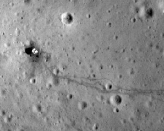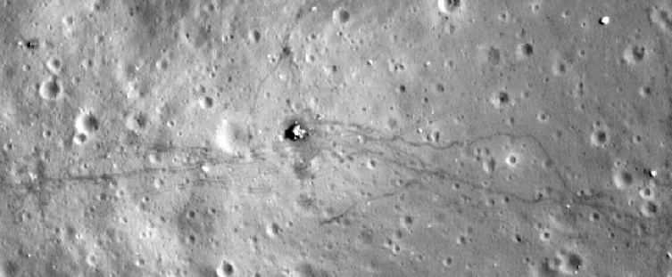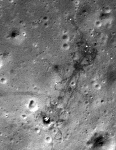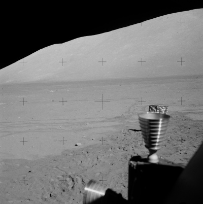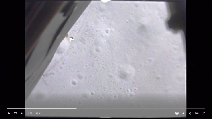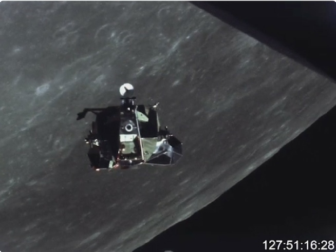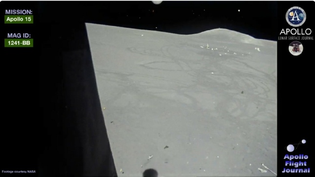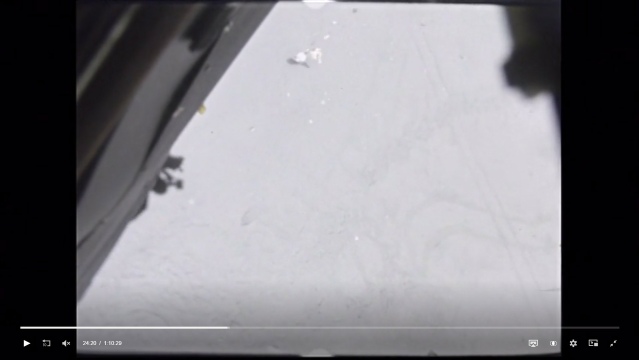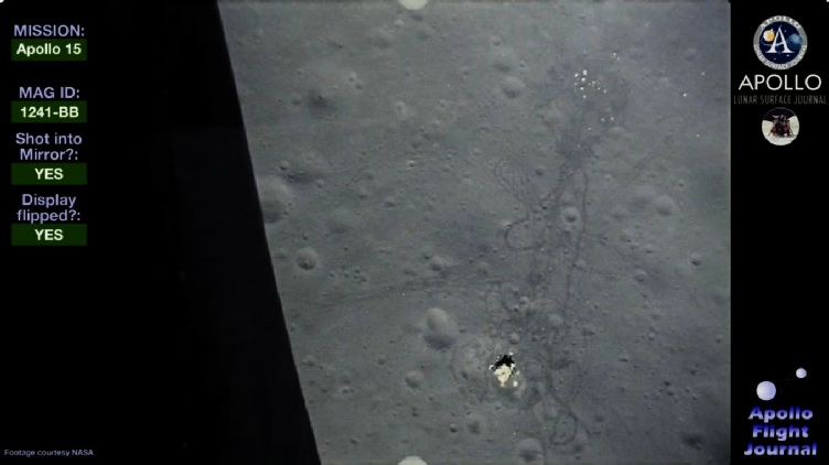 Whenever the LM pitches over and can see the landing site, the camera catches the trails left by men and machines that are seen decades later by craft in lunar orbit.