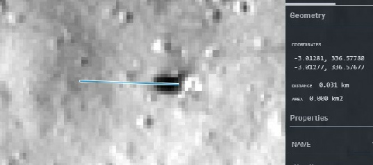 So that’s pretty much wrong from the start. Can we estimate the boulder shadow length? Why yes we can. The longest shadow is cast from the centre of the ring, and reaches pretty much to the edge. That would give a length of around 7 metres, as measured on the LRO quickmap. That gives a maximum height of the tallest feature present of around 1.75 metres.