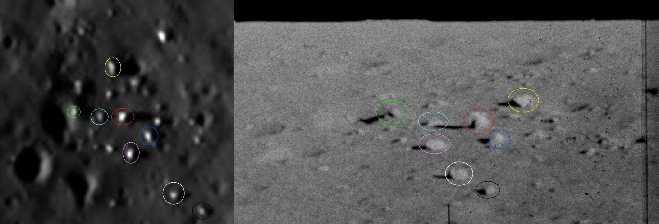 As for whether the boulders would actually have been visible, it’s debatable. The screen shot below taken from the approach video shows the view of the edge of Surveyor crater compared with Chandrayaan’s image (left) and the LRO view (right).