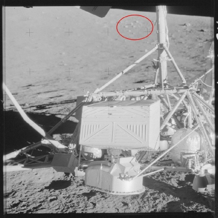 In a nutshell, there’s no contradiction between there being an apparent circle of boulders in aerial shots of Surveyor crater and none in the surface ones. They just aren’t recognisable as a surface feature, and as a result there was no reason for astronauts to go over and look at them. They didn’t mention them because they didn’t see them as a feature.