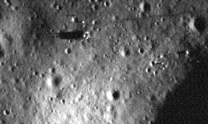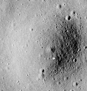 The Orbiter View: The boulders in the ring cast sharp, elongated shadows that are proportional to the shadow cast by the LM Intrepid.