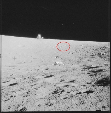 Now to the crux of the biscuit: how come they didn’t visit it, or even acknowledge its existence in any way? Well, to do that we need to see what the astronauts could see from their vantage point. Here are three photographs taken during their expedition into the crater: