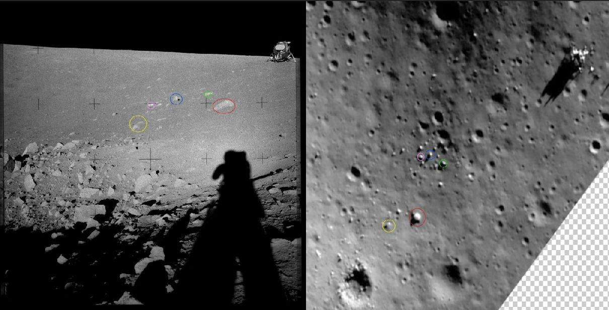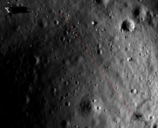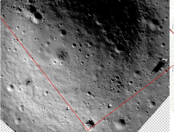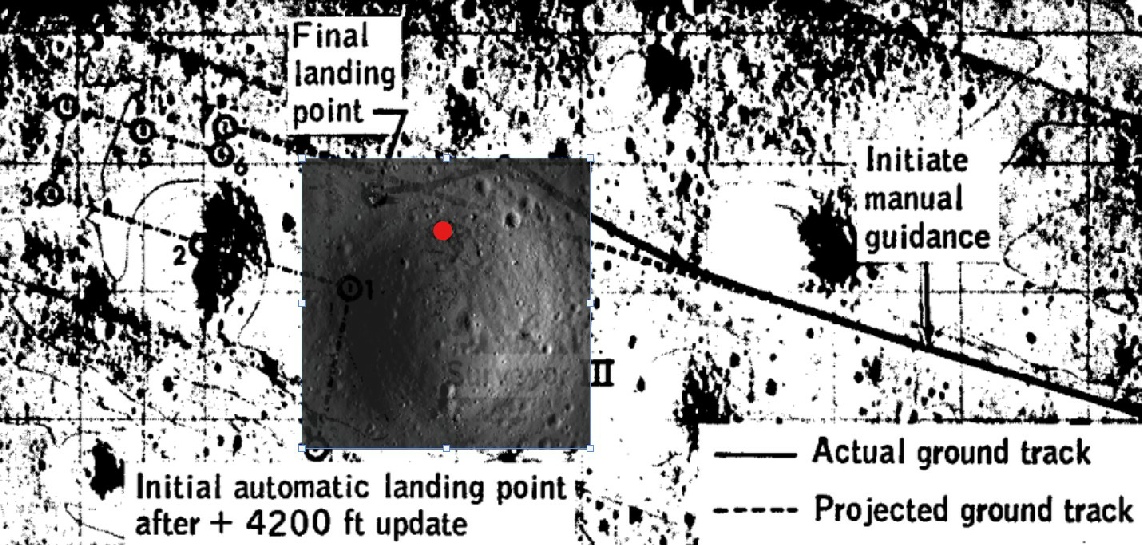 So wait, are they silent or not? We’ll let the misunderstanding about job titles slide, the whole Commander/Pilot thing is confusing. While Bean was technically called the ‘pilot’, it was Conrad’s job as Commander to actually do the ‘flying’. As for “ooh, look at those rocks”, well first of all you’d need to be flying over them. Here’s the actual ground track from the mission report, with Chandrayaan’s view superimposed, and a red dot identifying the boulder circle.