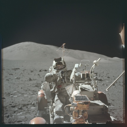 The transcripts, as he rightly points out, clearly identify Cernan as saying he took three photos, though there is no indication of how long the process took. He further declares the sequence to be impossible by noting the change in position of the scoop from one hand to another, and than missing altogether. Here’s the audio as recorded in the ALSJ: